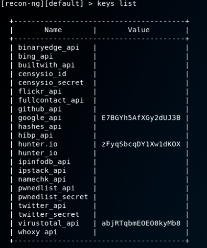 Recon-ng тоже полнофункциональный фреймворк веб-разведки, написанный на Python. В комплекте поставляются независимые модули, взаимодействие с собственной базой данных, удобные встроенные функции, интерактивная помощь и т.д. Из-за схожести интерфейса Recon-ng с Metasploit-framework освоиться будет куда проще, если был опыт использования последнего. Установить все доступные модули можно командой: marketplace install all при первом запуске инструмента т.к. они могут изначально отсутствовать. Некоторые модули при работе взаимодействуют с API различных сервисов, таких как: Google, Github, Bing и т.д. для них необходимо будет получить API ключ и указать его командой keys add. Посмотреть список ключей можно командой keys list, где будет выведена таблица.