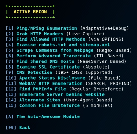 Так как нас интересует только сбор информации, то и рассматривать будем только один раздел, содержащий порядка 50 модулей. Здесь можно проводить как пассивный сбор данных: