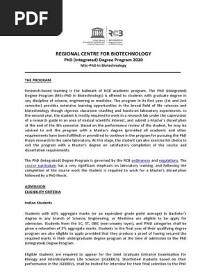The PhD (integrated) program is governed by the RCB ordinances and regulations . The course curriculum has a very significant emphasis on laboratory training, and following the completion of the course work the student is required to work for a Master's dissertation followed by a PhD thesis . MSc-PhD curriculum