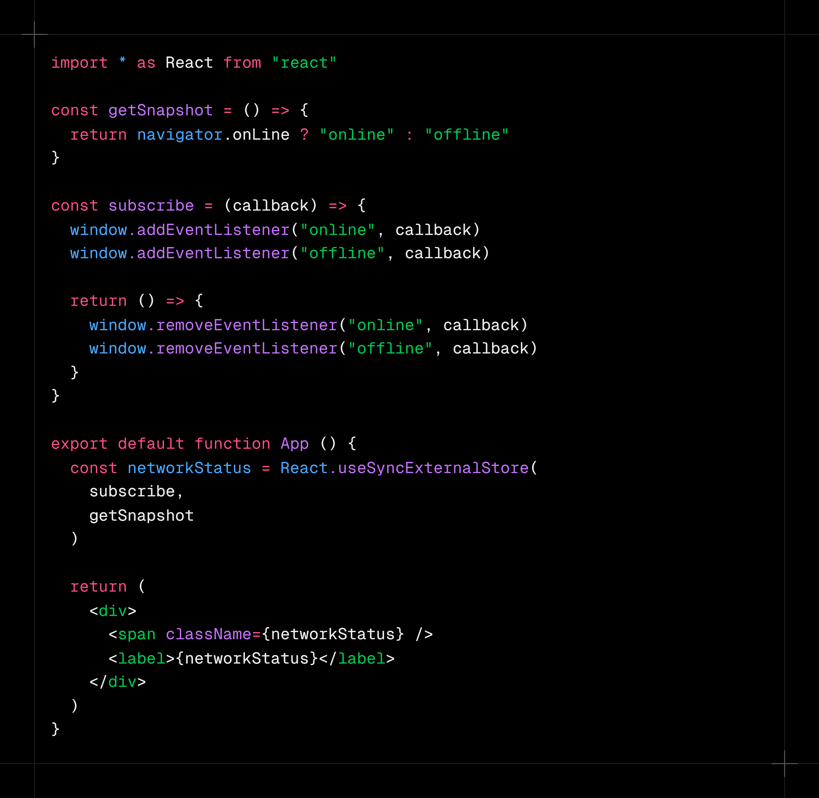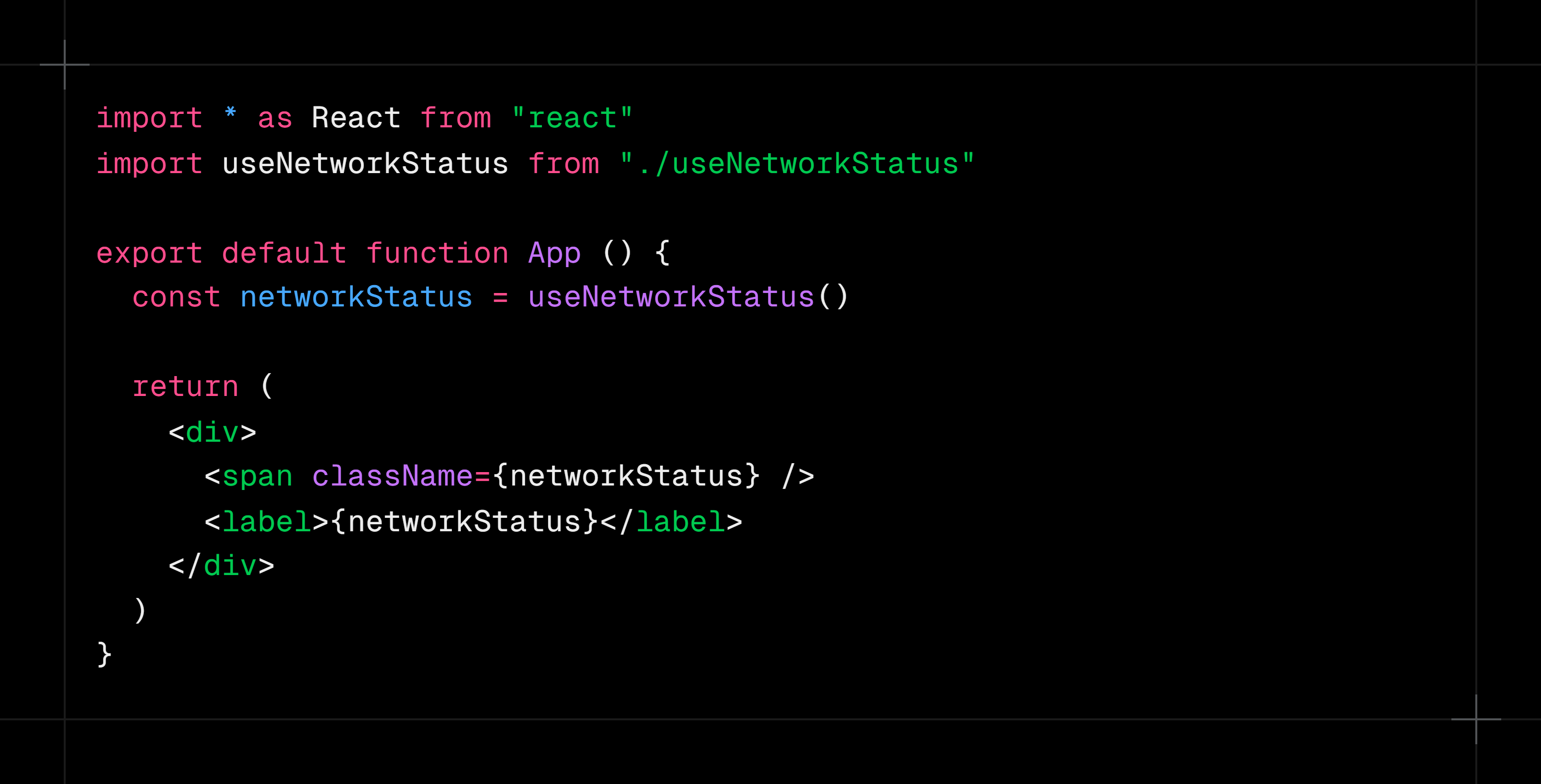 E'tibor bering useNetworkStatus shunchaki use bilan boshlanadigan va ichida boshqa hookni ishlatayotgan oddiy funksiya. Bu custom hookning sodda ta'rifi.