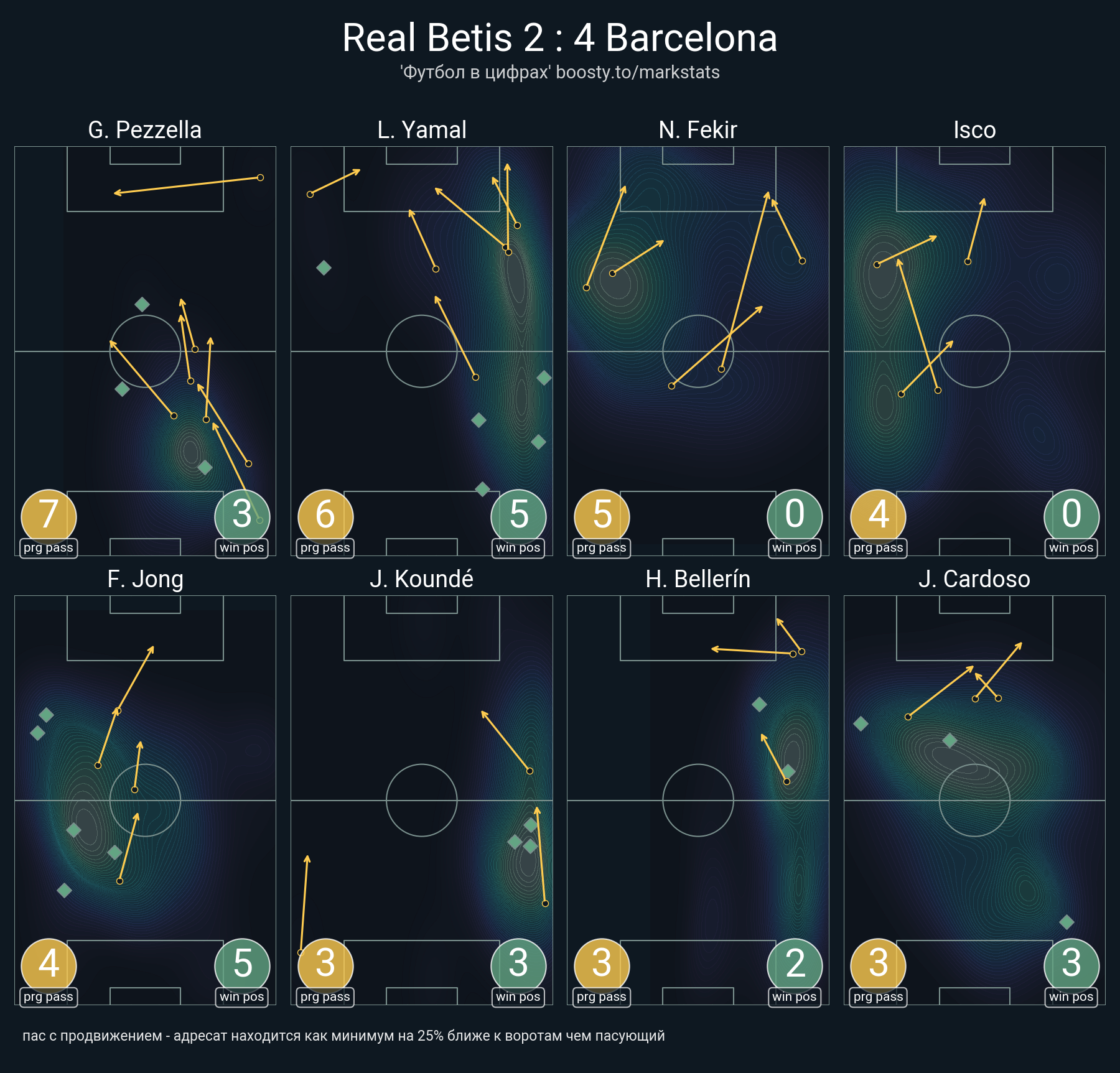 23 успешных передач из 24 попыток (3 с продвижением, 5 на трети соперника)