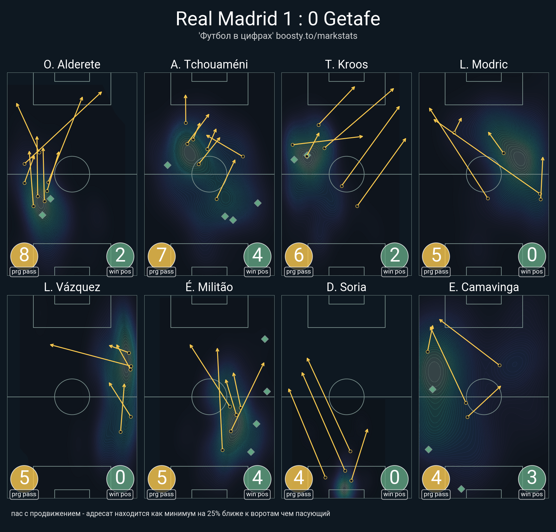 22 успешных передач из 35 попыток (8 с продвижением, 1 на трети соперника)
