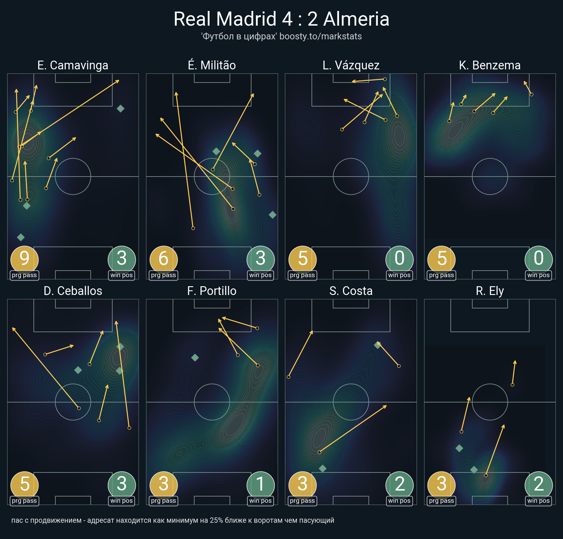 73 успешных передач из 81 попыток (1 ассист, 1 под удар, 5 с продвижением, 23 на трети соперника)