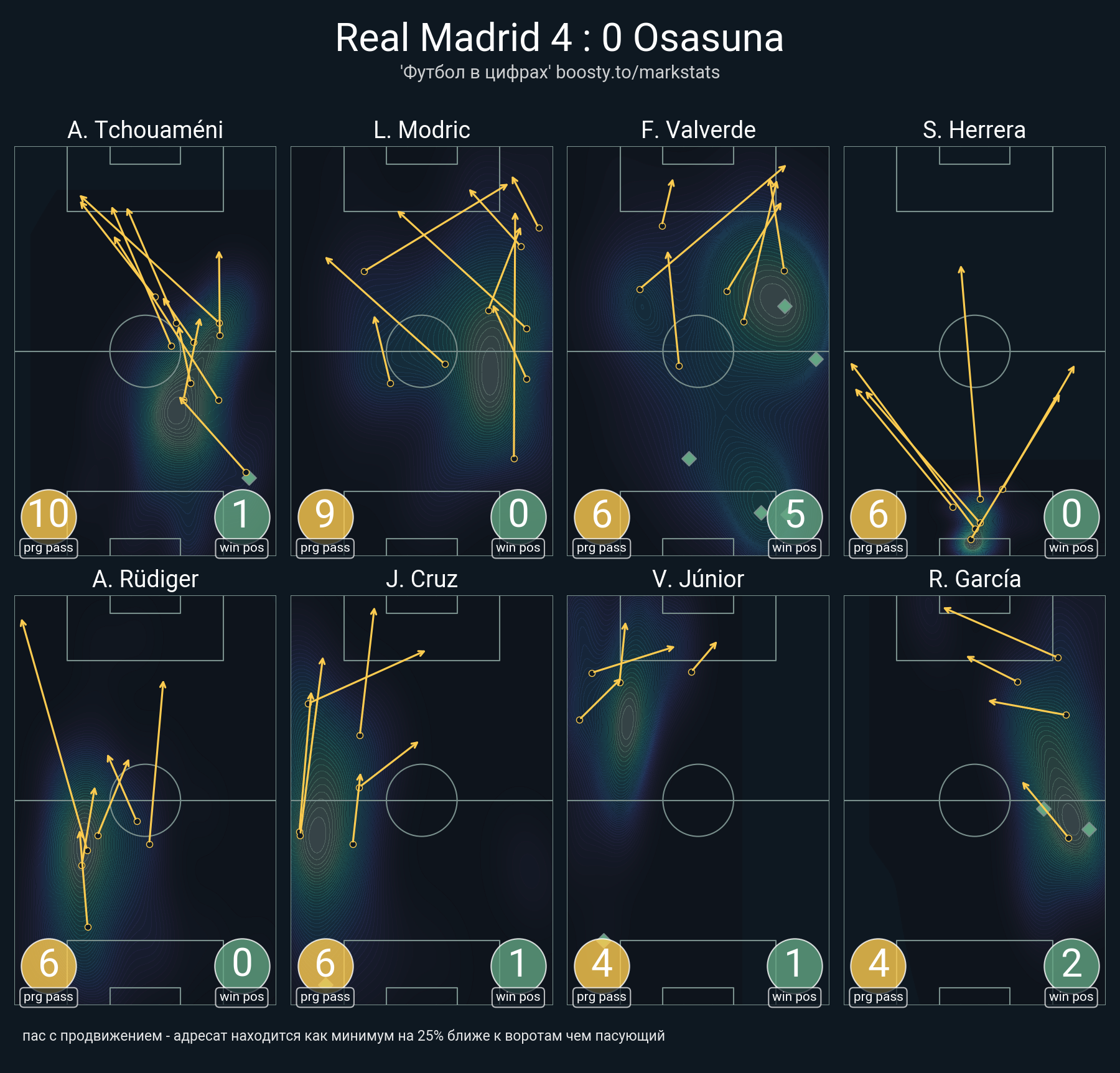 21 успешных передач из 27 попыток (1 ассист, 1 под удар, 4 с продвижением, 10 на трети соперника)