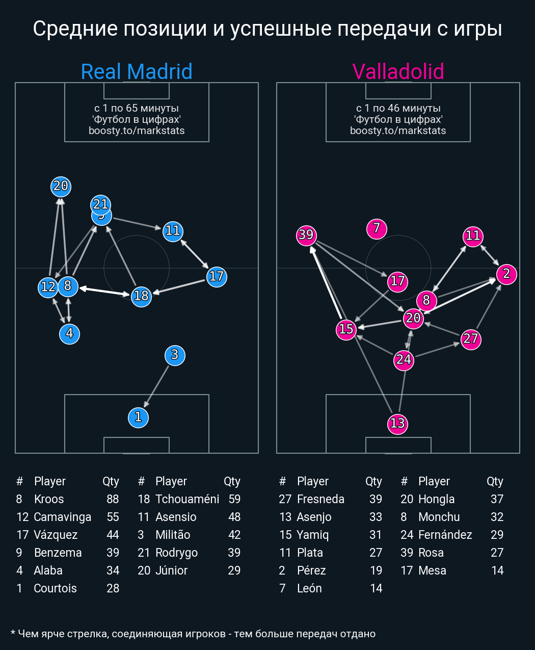 32 успешных передач из 39 попыток (2 ассист, 3 под удар, 2 с продвижением, 14 на трети соперника)