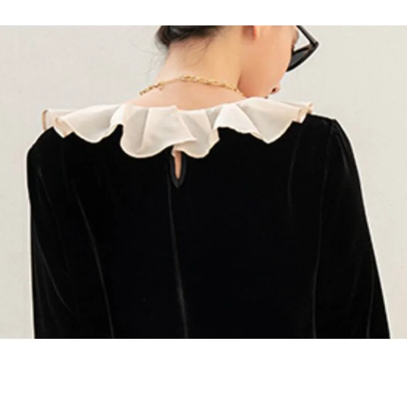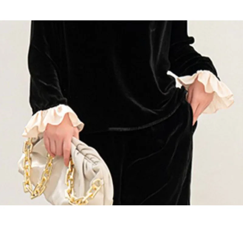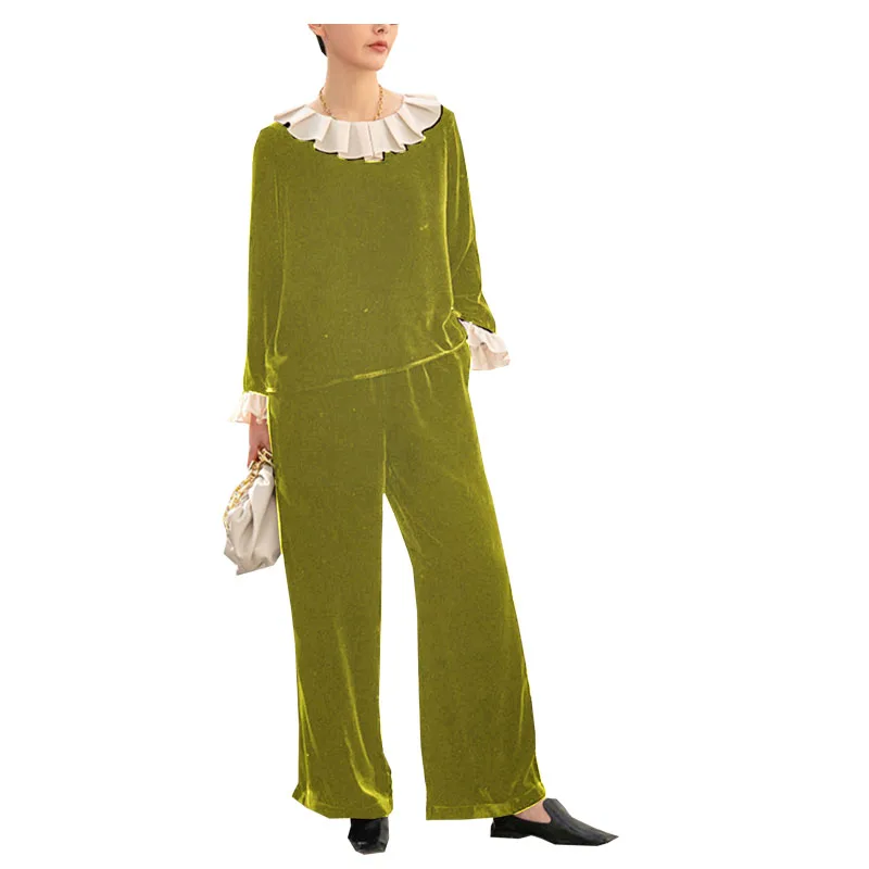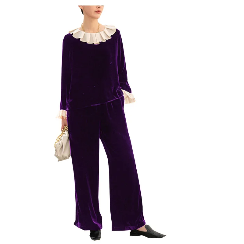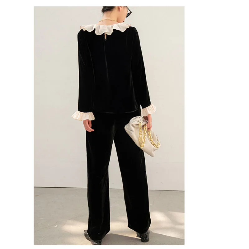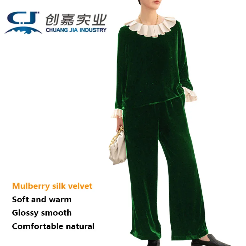 pKInTrKFzoHere you can buy Real silk Velvet Spring Autumn Women's Long Sleeve Straight Trousers Set Ruffled Edge Light Luxury Smooth Luster Free Shipping with free delivery to your post office.