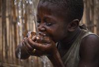 Подпись к фото, . . . ребенок пьет воду из бутылки из-под отбеливателя, Гаити, 2010 год) . . .
