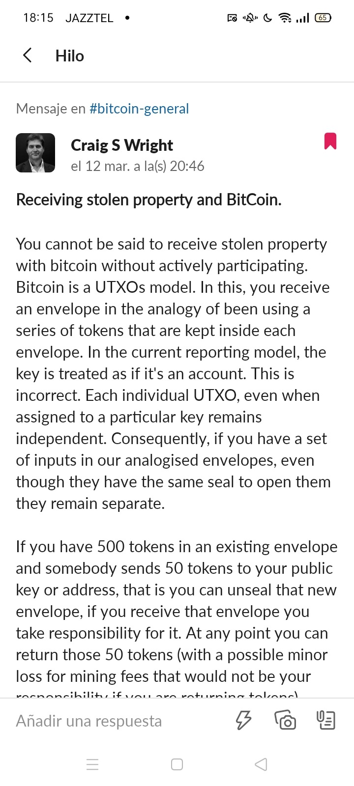 The way I designed bitcoin is analogous as I've said to a set of envelopes containing tokens. Each of these tokens is equivalent in nature to a grain of wheat. When grain is mixed, there are rules in law that allow for the tracing of separations. As bitcoin is fungible, you can trace through a mixture. It is not the same as if you were to mix wheat and rice or wine and vinegar. It is not the individual grains of wheat that matter, rather it is the quantity.