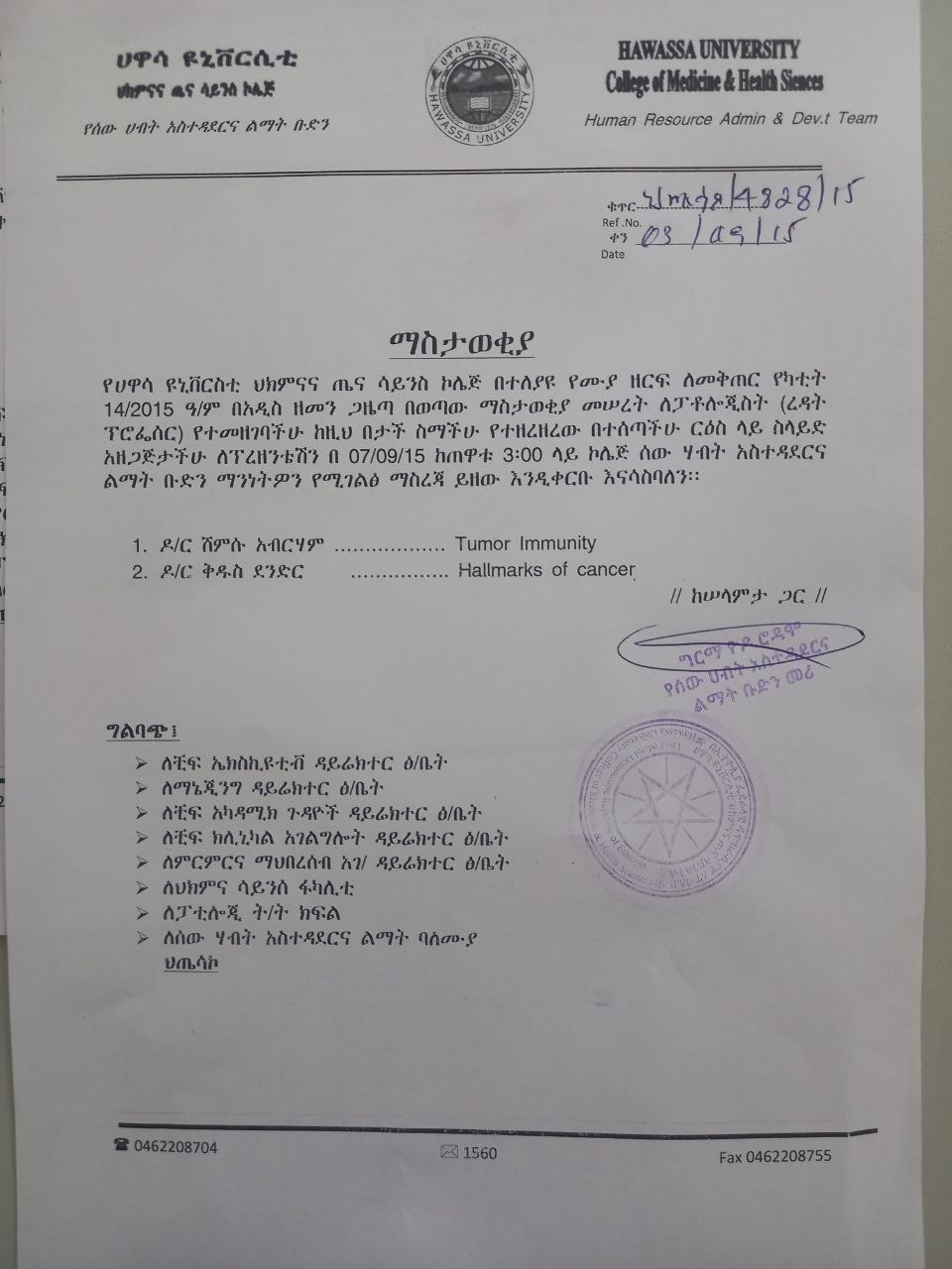 Hawassa University CMHS Call for Presentation for Pathologists (Assistant Professor) Applicants