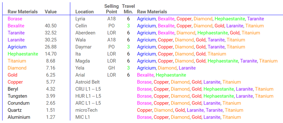 Se aconseja minar los minerales rosas, morados o azules de la siguiente imagen según localizaciones y puntos de venta.