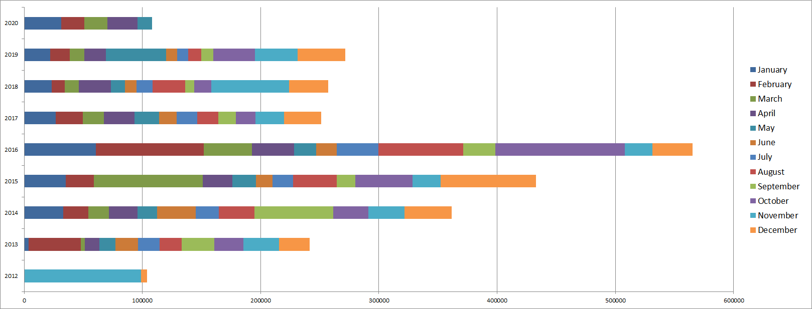 También podemos comparar con el siguiente gráfico el crecimiento de cuentas en RSI mes a mes en estos años desde 2012 hasta hoy día donde acaba de alcanzar los 2,6 millones de cuentas (no todas tienen paquete de juego, se estima que la mitad tendrían juego):