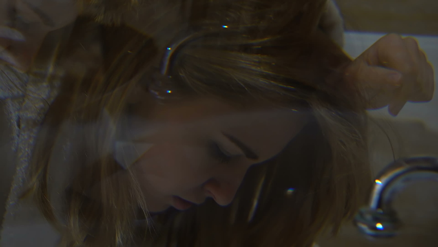 Redhead rubbing in the water closet