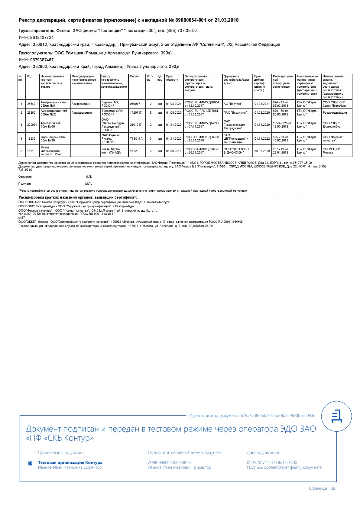 Реестр выданных деклараций соответствия