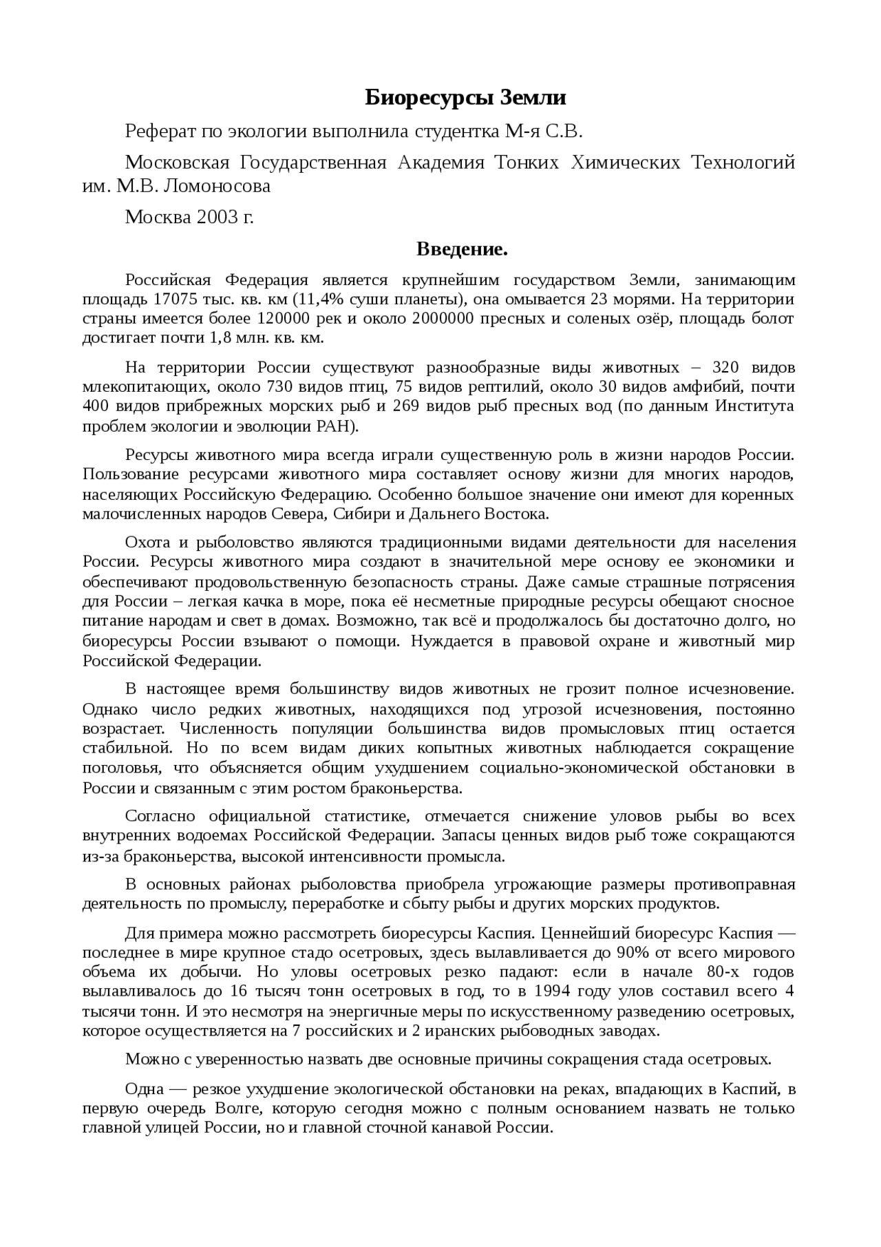 Биоресурсы Земли . 22 .03 .2003/ реферат . Водные биоресурсы и их рациональное использование .