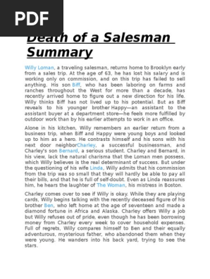 Death of a Salesman is a play by Arthur Miller that was first performed in 1949 . Summary Read our full plot summary and analysis of Death of a Salesman , scene by … Act I ‧ Plot Overview ‧ Character List ‧ Themes ‧ Willy Loman ‧ Act II