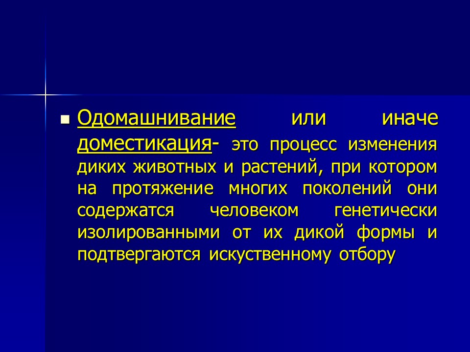 Одомашнивание животных Одомашнивание или иначе доместикация — это процесс изменения диких животных или растений, при котором на протяжении многих поколений они …