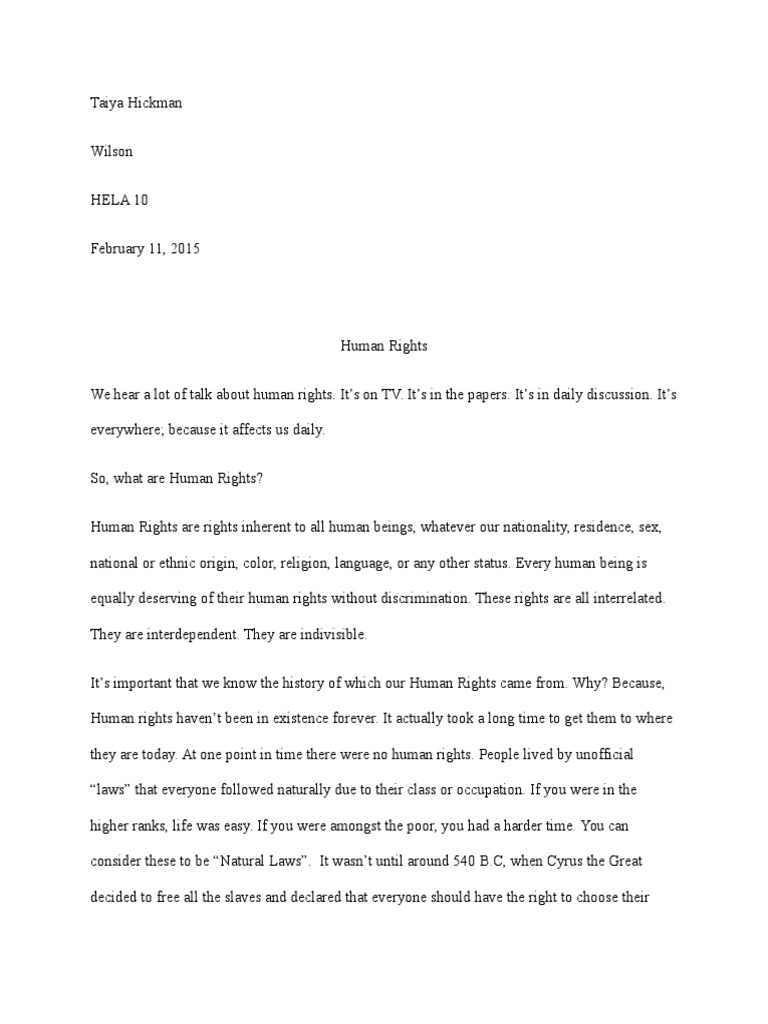 Human Rights Sample Essay Outline Introduction Thesis: Human rights guarantee equal treatment of all people irrespective of their color, gender, religion or nationality . Body Paragraph 1: Every human being is entitled to all human rights upon their conception . All persons are entitled to their human rights without discrimination .