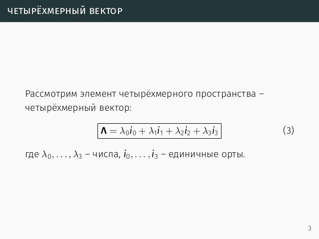 1 .2 Вид числа и выполнение арифметических операций . Кватернион — это четверки действительных чисел ( ; ; ; ;), которые удобно записывать в виде: , где , , , и - коэффициенты, являющиеся произвольными вещественными числами . Кватернион , у которого вещественная часть , называется . . .