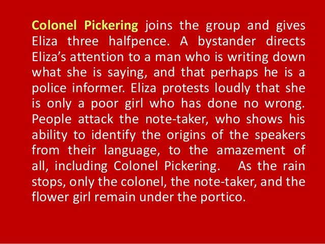 But ina play like Pygmalion , not only an introduction is needed, the reader or viewerof a play need additional information on the different characters . They need toknow something about their background, what they are doing on or in a certainscene . The audience also needs this background information to . . .