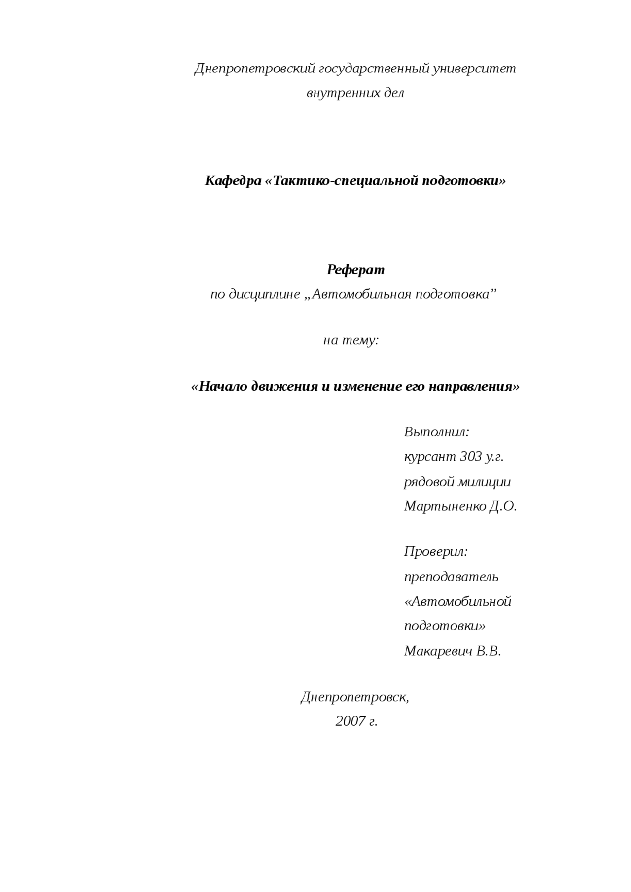 на тему: «Начало движения и изменение его направления» Выполнил: курсант 303 у .г . рядовой милиции . Мартыненко Д .О . Проверил: преподаватель «Автомобильной …