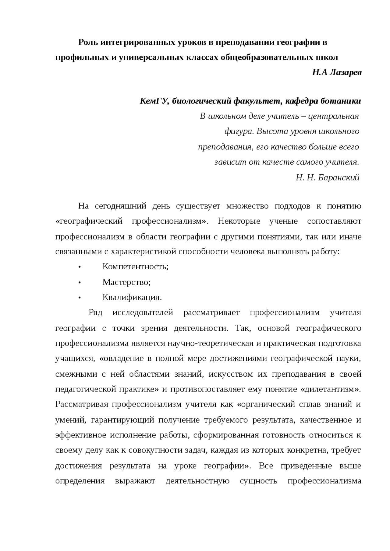Роль интегрированных уроков в преподавании географии в профильных и универсальных классах общеобразовательных школ . Н .А Лазарев . КемГУ …