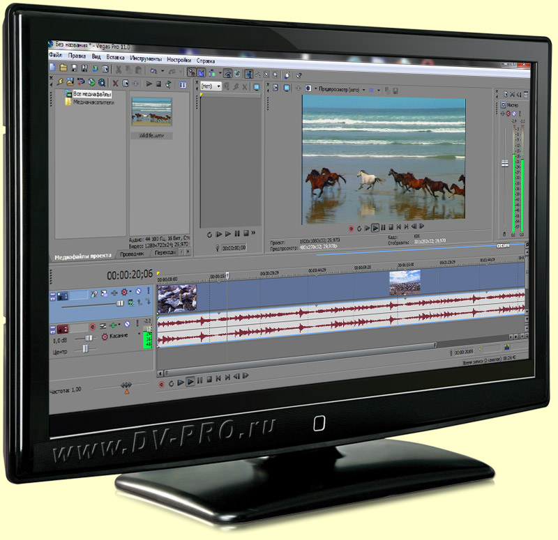 SONY Vegas Pro - профессиональный видеоредактор для нелинейного монтажа и многоканальной звуковой записи . Обеспечивает обработку видеоэффектами в реальном времени, поддерживает неограниченно