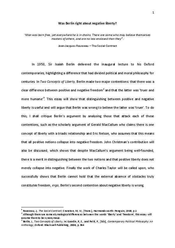 Four Essays on Liberty (Oxford, Oxford University Press, 1969, p .125)] Berlin argued strongly for negative liberty in his Four Essays on Liberty , yet I think …