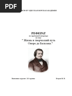 Реферат: Биография и творческая деятельность Оноре де Бальзака . Оноре де Бальзак (фр . Honoré de Balzac) (Годы жизни: (8)20 мая 1799, Тур — (6)18 августа 1850, Париж) — известнейший французский писатель . Он известен такими произведениями, как эпопея «Человеческая комедия», роман «Шуаны . . .