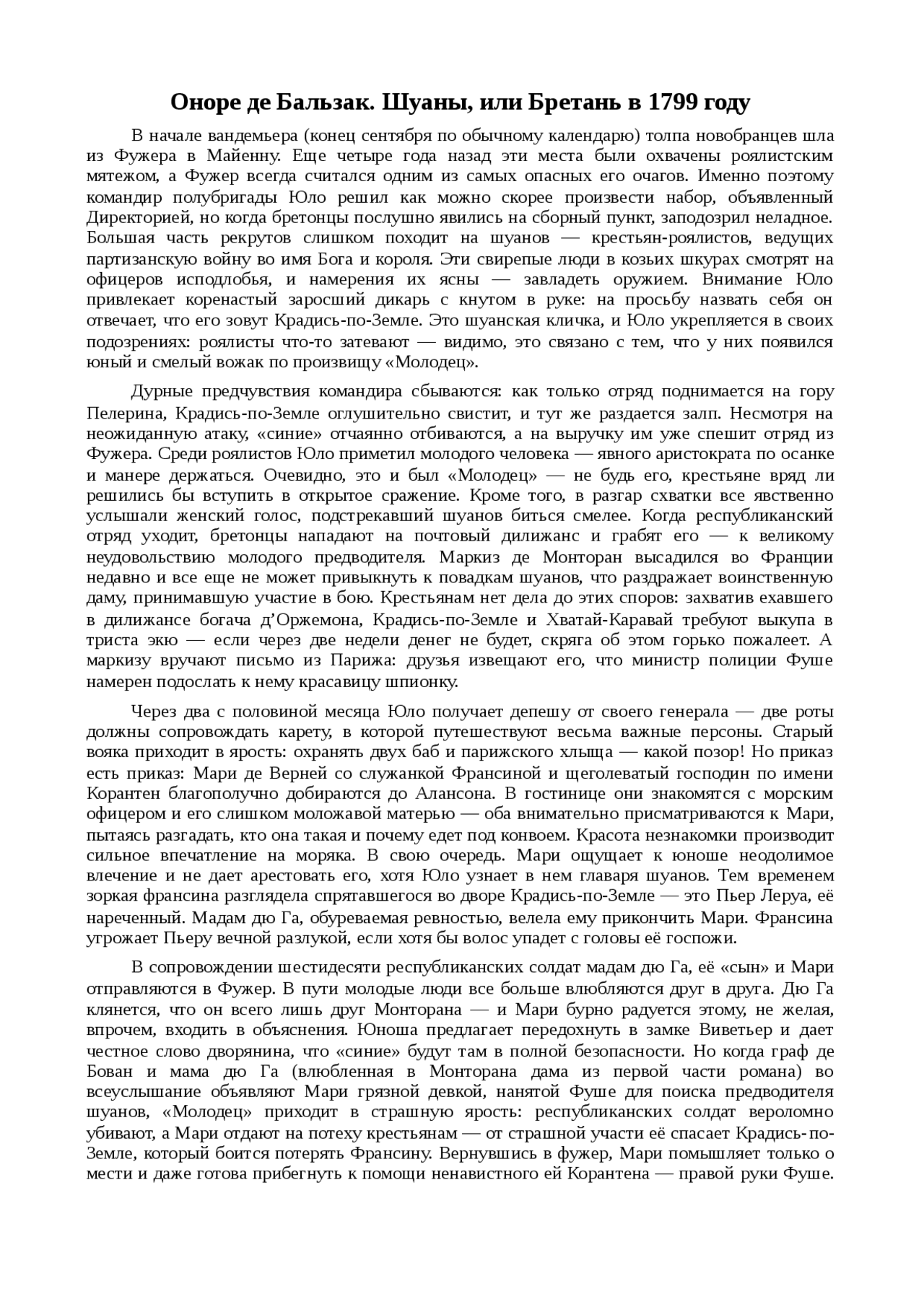 Краткое изложение Шуаны, или Бретань в 1799 году . В начале вандемьера (конец сентября по обычному календарю) толпа новобранцев шла из Фужера в Майенну . Еще четыре года назад эти места были охвачены роялистским мятежом, а Фужер всегда считался одним из самых опасных его . . .