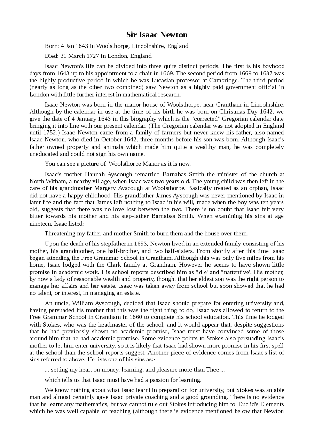 Sir Isaac Newton . Born: 4 Jan 1643 in Woolsthorpe, Lincolnshire, England . Isaac Newton was born in the manor house of Woolsthorpe, near Grantham in Lincolnshire . Although by the calendar in use at the time of his birth he was born on Christmas Day 1642, we give the date of 4 January 1643 in this . . .