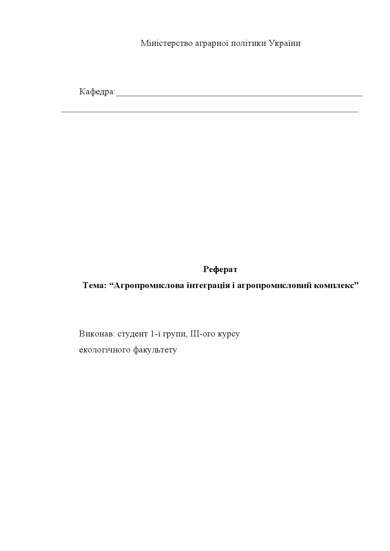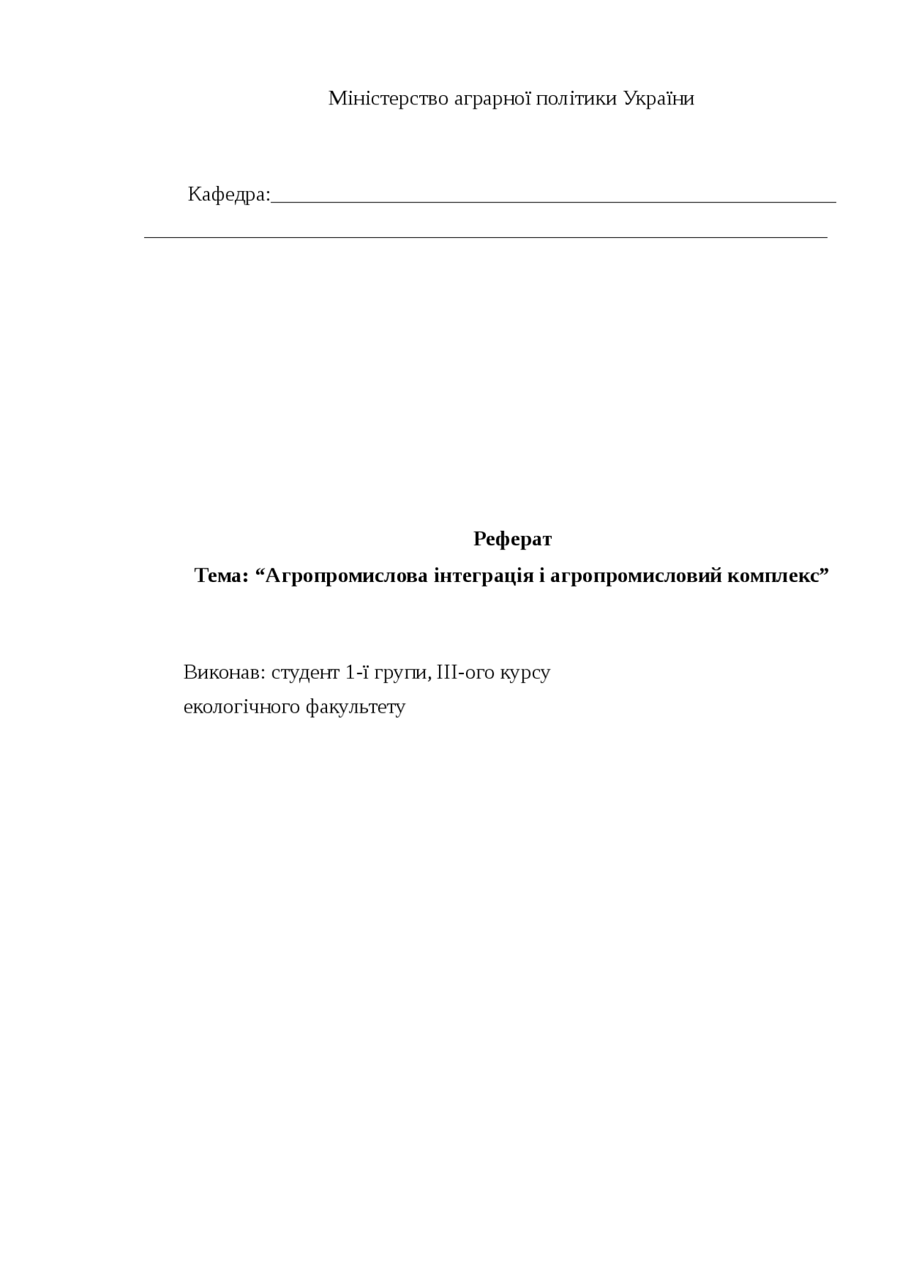 Реферат . Тема: " Агропромислова інтеграція і агропромисловий комплекс " Виконав: студент 1-ї групи, ІІІ-ого курсу . екологічного факультету . Зміст