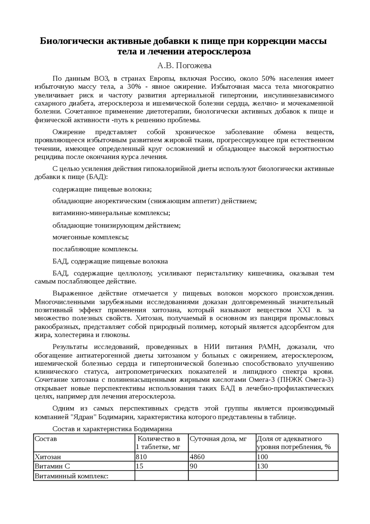 Биологически активные добавки к пище при коррекции массы тела и лечении атеросклероза . Реферат по медицине, физкультуре и здравоохранению .