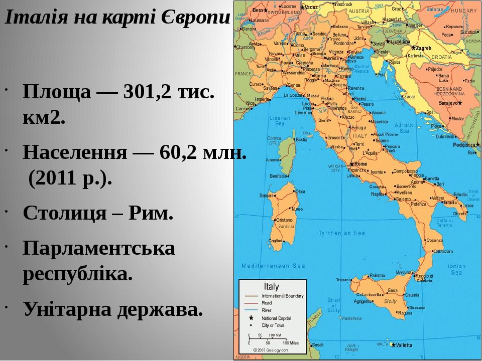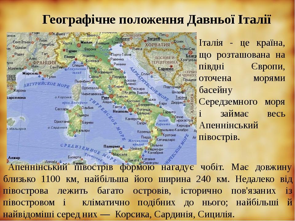 Територія та географічне положення . Італія — держава на півдні Європи . На її території можна виділити три частини: материкову (близько 1/3 площі), півострівну (Апеннінський півострів) й острівну (острови Сицилія, Сардинія й низка дрібних островів) . Італія — морська країна . . .