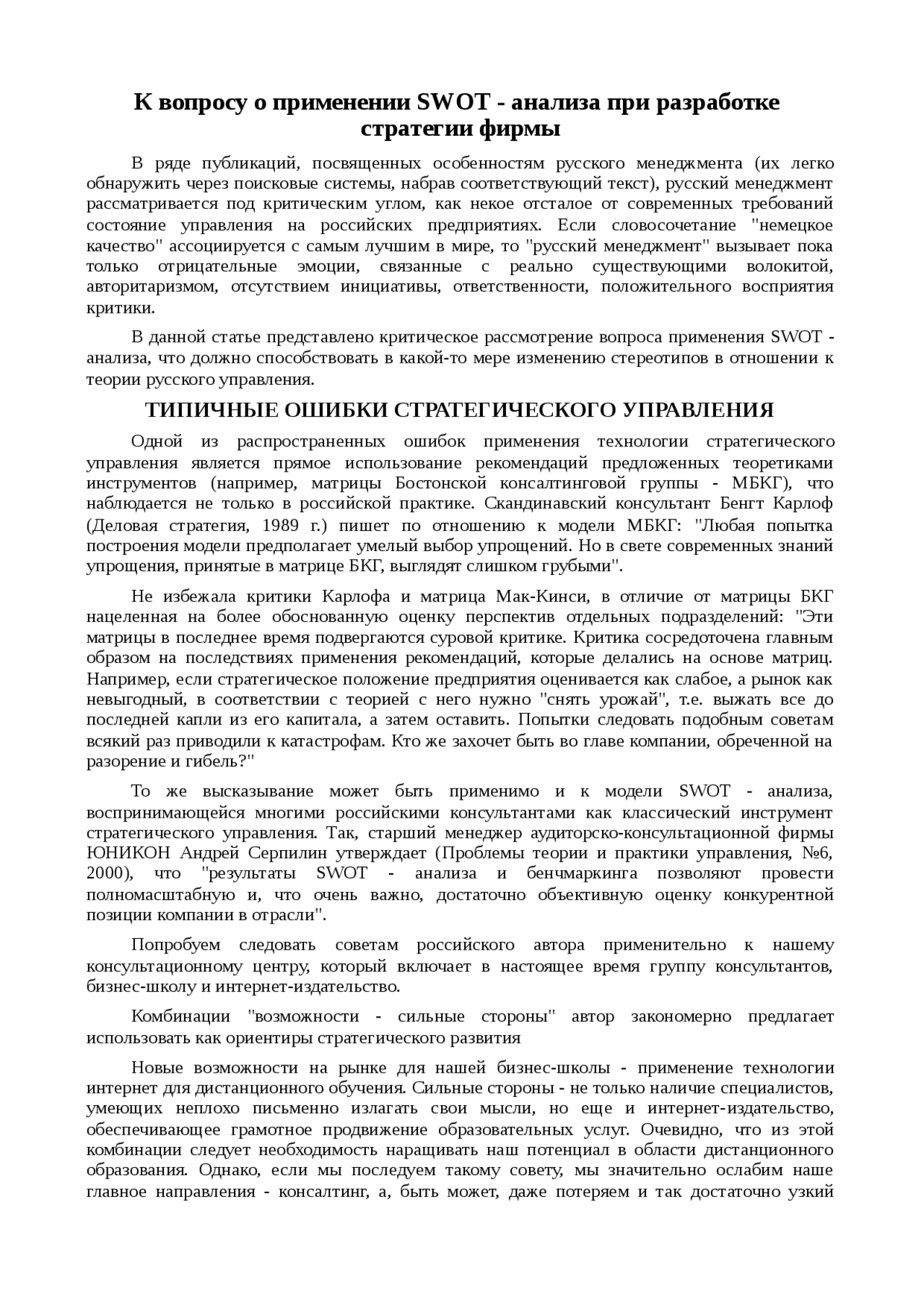 Реферат по теме К вопросу о применении SWOT - анализа при разработке стратегии фирмы