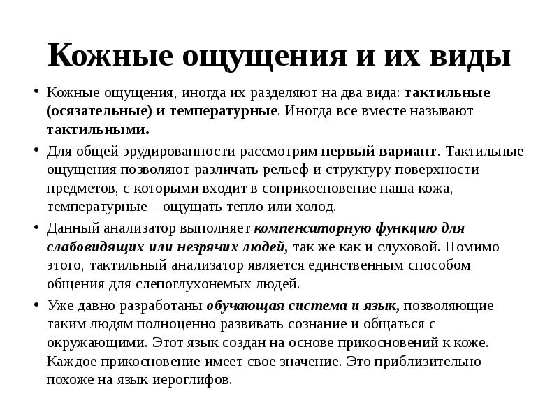 Ощущения осязательные (или кожные) - включают в себя три различных вида ощущений, имеющих свои анализаторы: тактильные (прикосновения и давления), температурные …