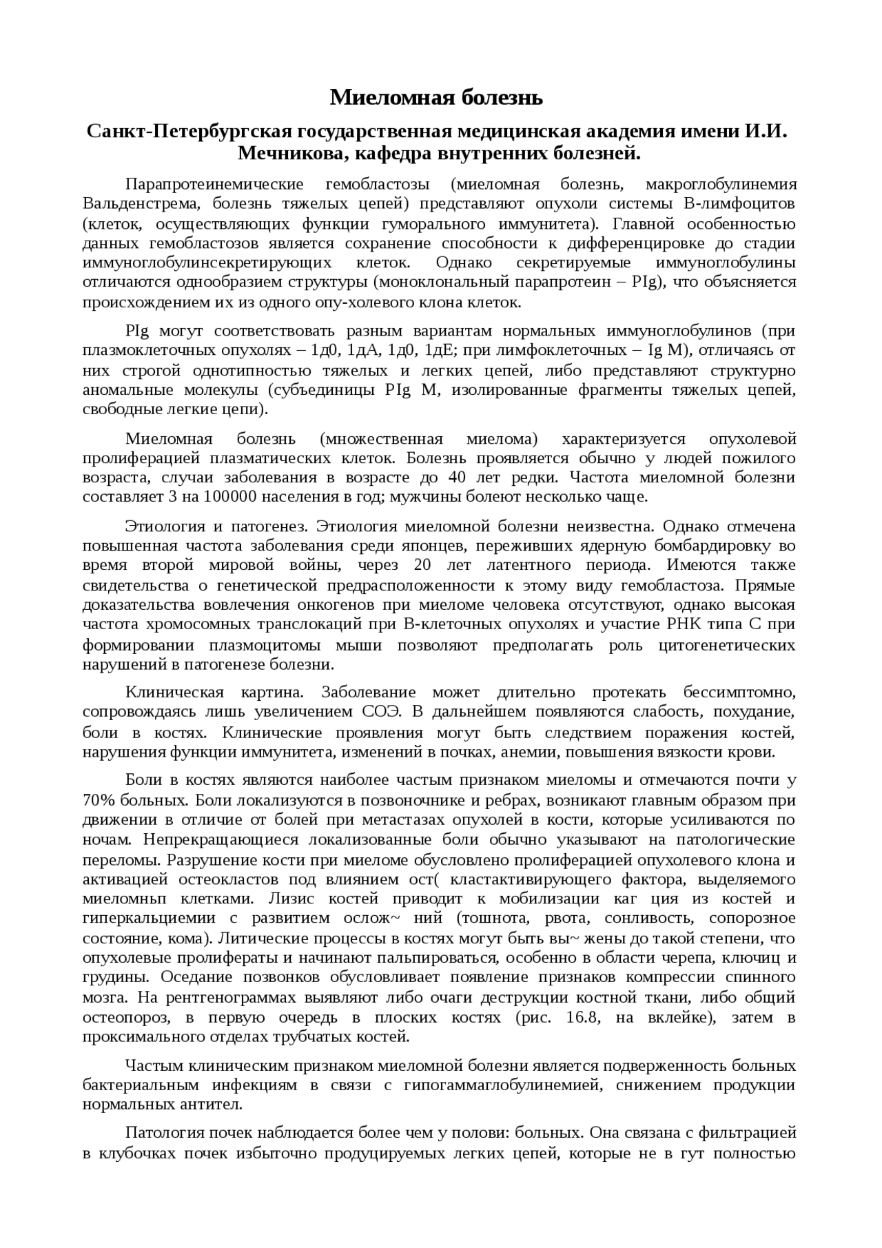 Реферат на тему "Миеломная болезнь" скачать бесплатно