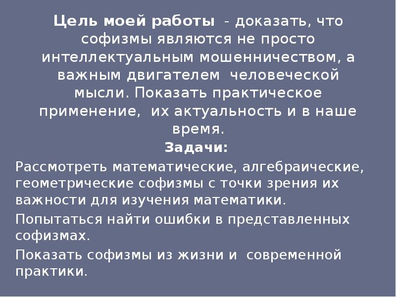 Основные создатели софизмов - древнегреческие ученые-философы, но тем не менее, они создавали математические софизмы, основываясь на элементарных аксиомах, что еще …