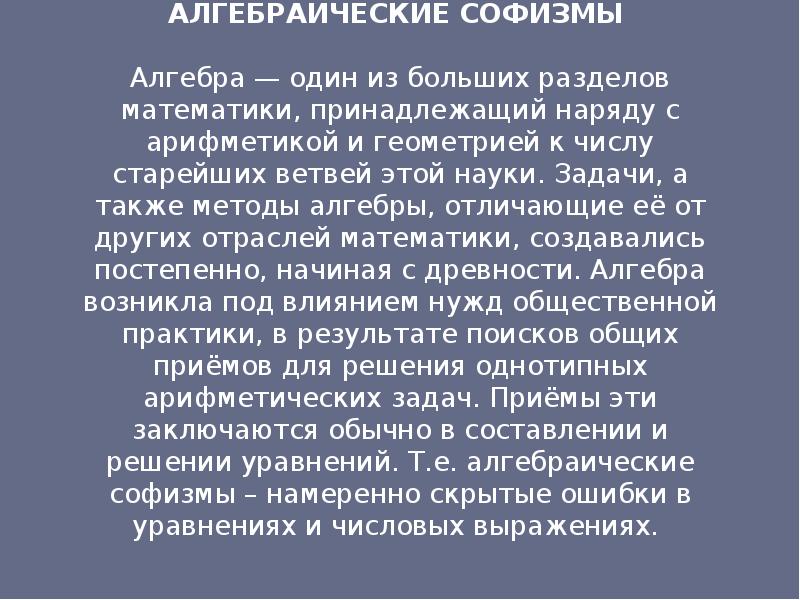 Софизмы - Реферат , страница 1 . В настоящее время уроки математики, на мой взгляд, в своем большинстве проходят сухо, однообразно и не всегда вызывают особого …