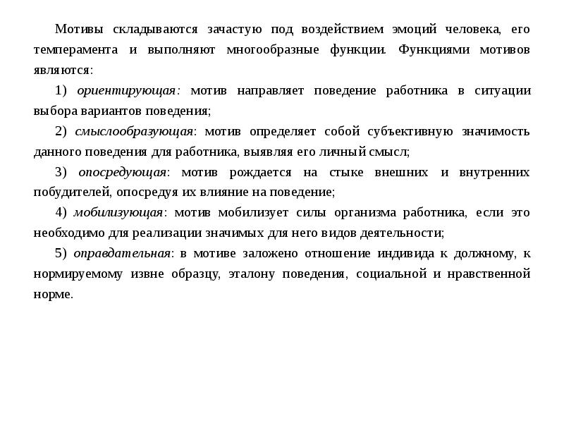 Мотивы поведения людей на рабочем месте Человек, выполняя работу, руководствуется в своей деятельности далеко не одним мотивом, а разнонаправленными мотивами или сложной цепочкой последовательно связанных мотивов .