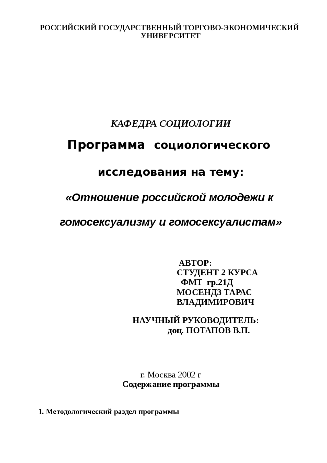 РОССИЙСКИЙ ГОСУДАРСТВЕННЫЙ ТОРГОВО-ЭКОНОМИЧЕСКИЙ УНИВЕРСИТЕТ КАФЕДРА СОЦИОЛОГИИ Программа социологического исследования на тему: «Отношение российской молодежи к гомосексуализму и гомосексуалистам»