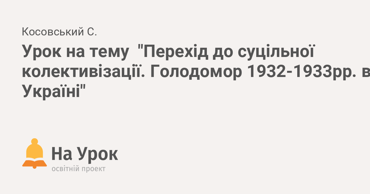 Тема: Суцільна колективізація . Голодомор 1932-1933 рр . Мета: охарактеризувати радянську політику суцільної колективізації, визначити її хронологічні рамки …