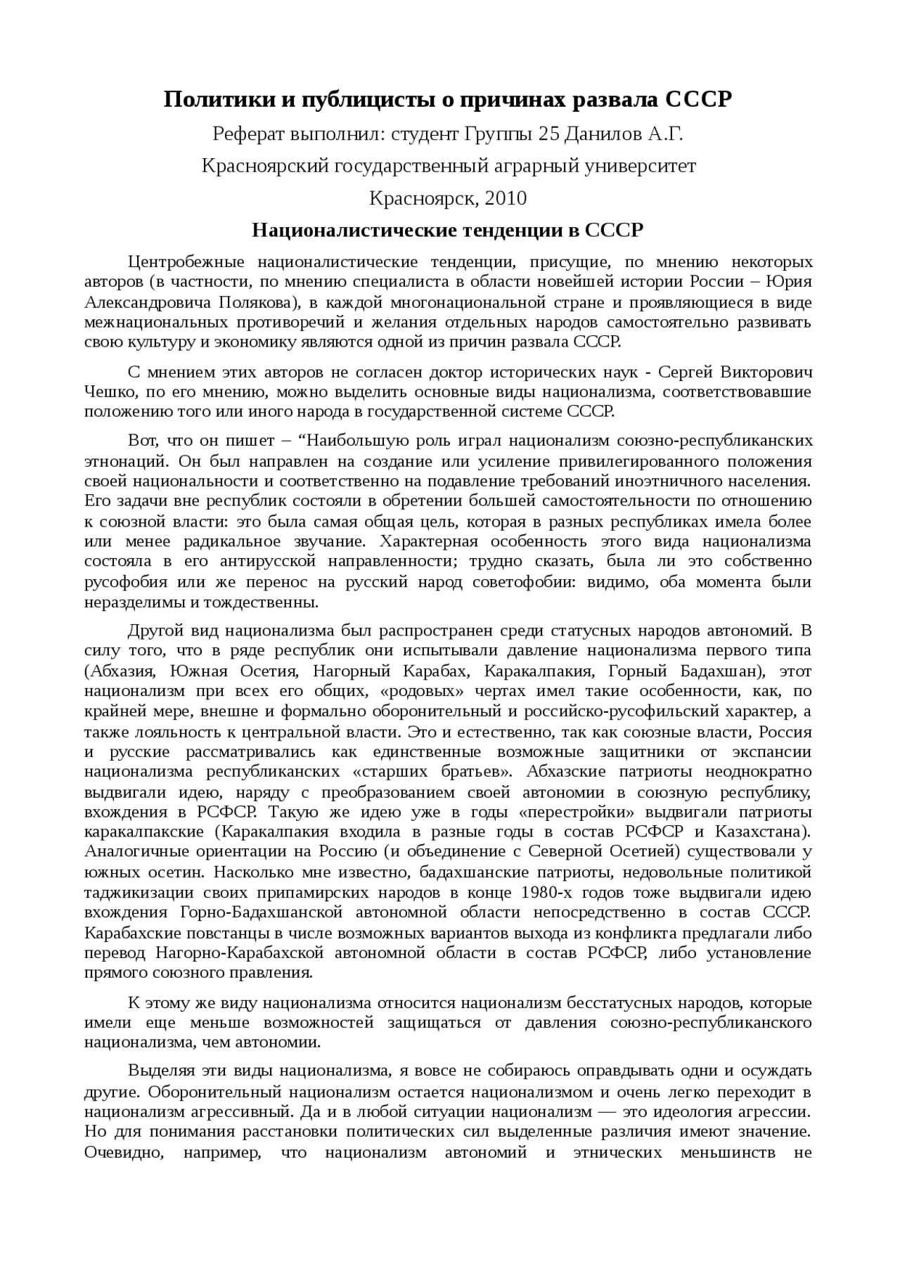 Реферат по теме Политики и публицисты о причинах развала СССР
