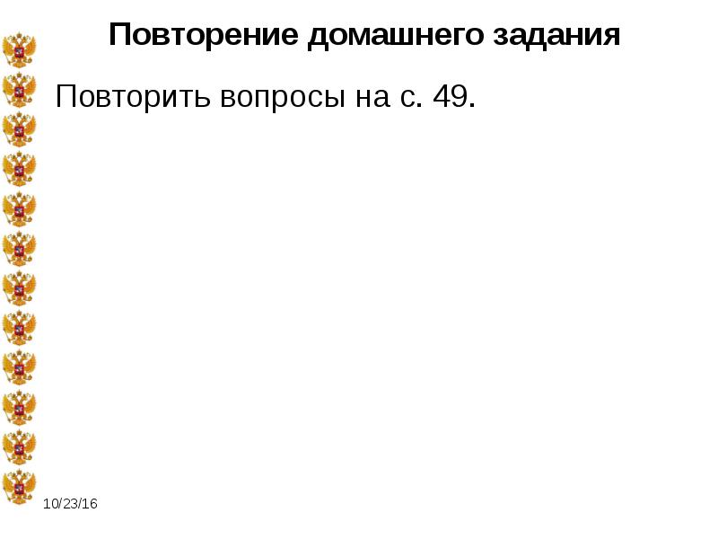 Презентация на тему: Появление государства у восточных славян . Презентация на тему: Появление государства у восточных славян . Скачать эту презентацию . № слайда 1 . Описание слайда: Повторение домашнего задания Повторить вопросы на с . 49 . № слайда 2 .