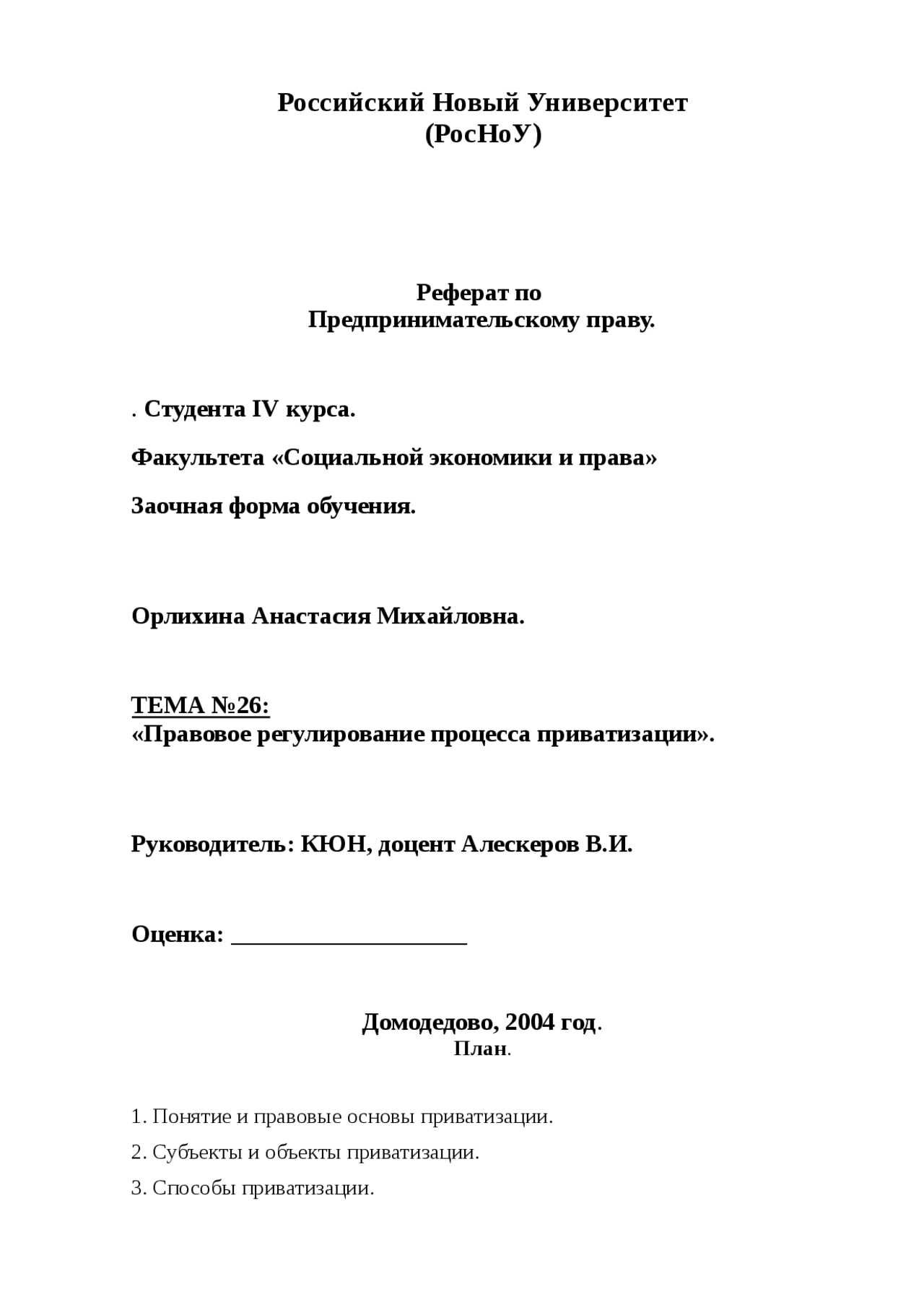 ТЕМА №26: «Правовое регулирование процесса приватизации» . Руководитель: КЮН, доцент Алескеров В .И . Оценка: _____ Домодедово, 2004 год . План . 1 . Понятие и …