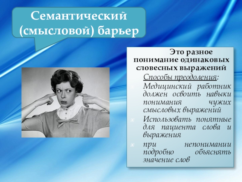 Семантический барьер непонимания возникает, когда фонетически язык «наш», но по передаваемому смыслу «чужой» . Это возможно по следующим причинам .