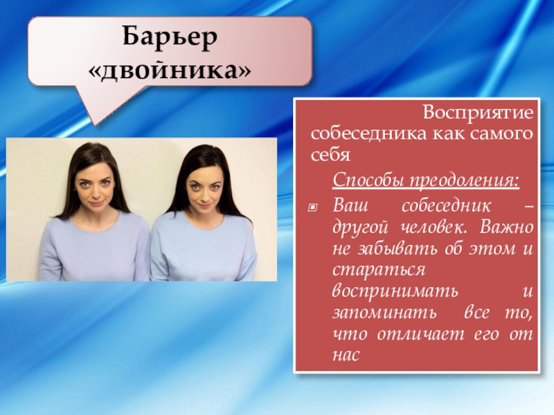по теме: Преодоление барьеров в общении . . . .сообщения . . . . По крайней мере, до тех пор, пока человек не докажет обратное . 3) . . . Барьер ожидания непонимания .