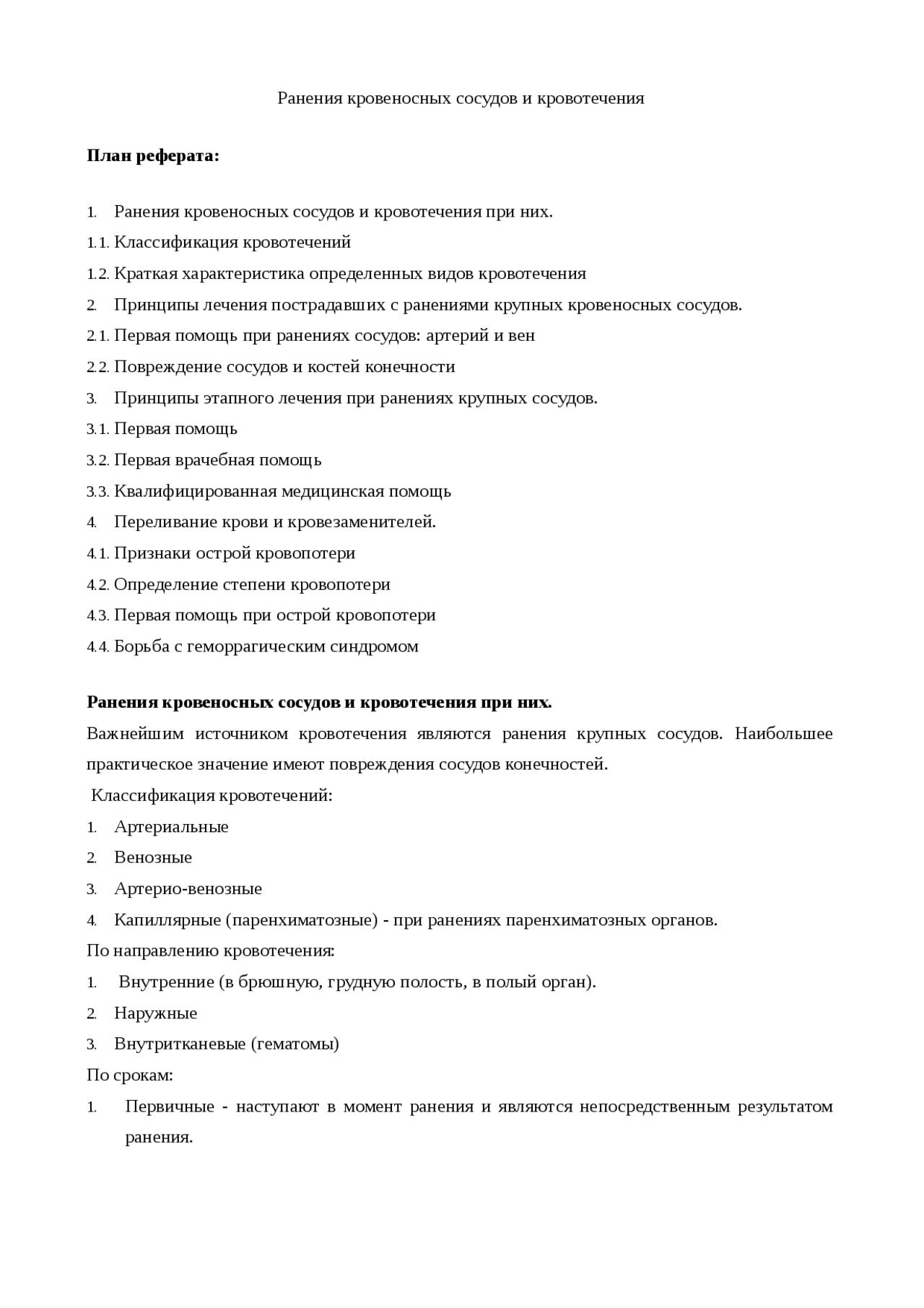 План реферата: 1 . Ранения кровеносных сосудов и кровотечения при них . 1 .1 Классификация кровотечений . 1 .2 Краткая характеристика определенных видов кровотечения . 2 . Принципы лечения пострадавших с ранениями крупных кровеносных сосудов .