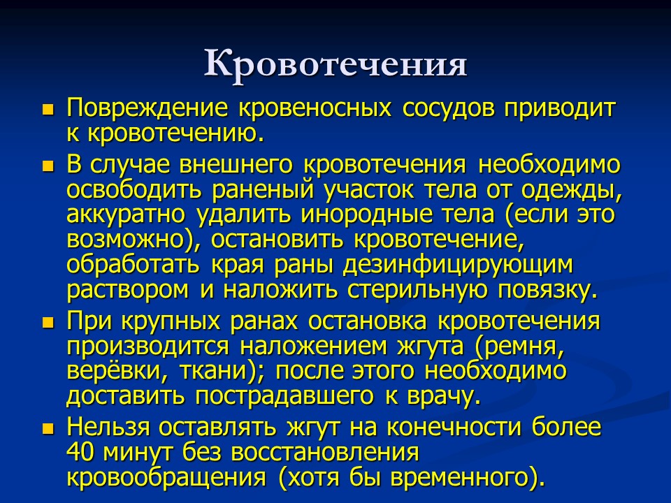 Кровотечения - излитие крови из кровеносных сосудов при нарушении целости их стенки . Опасность кровотечений заключается в том, что оно может привести к значительной кровопотере .