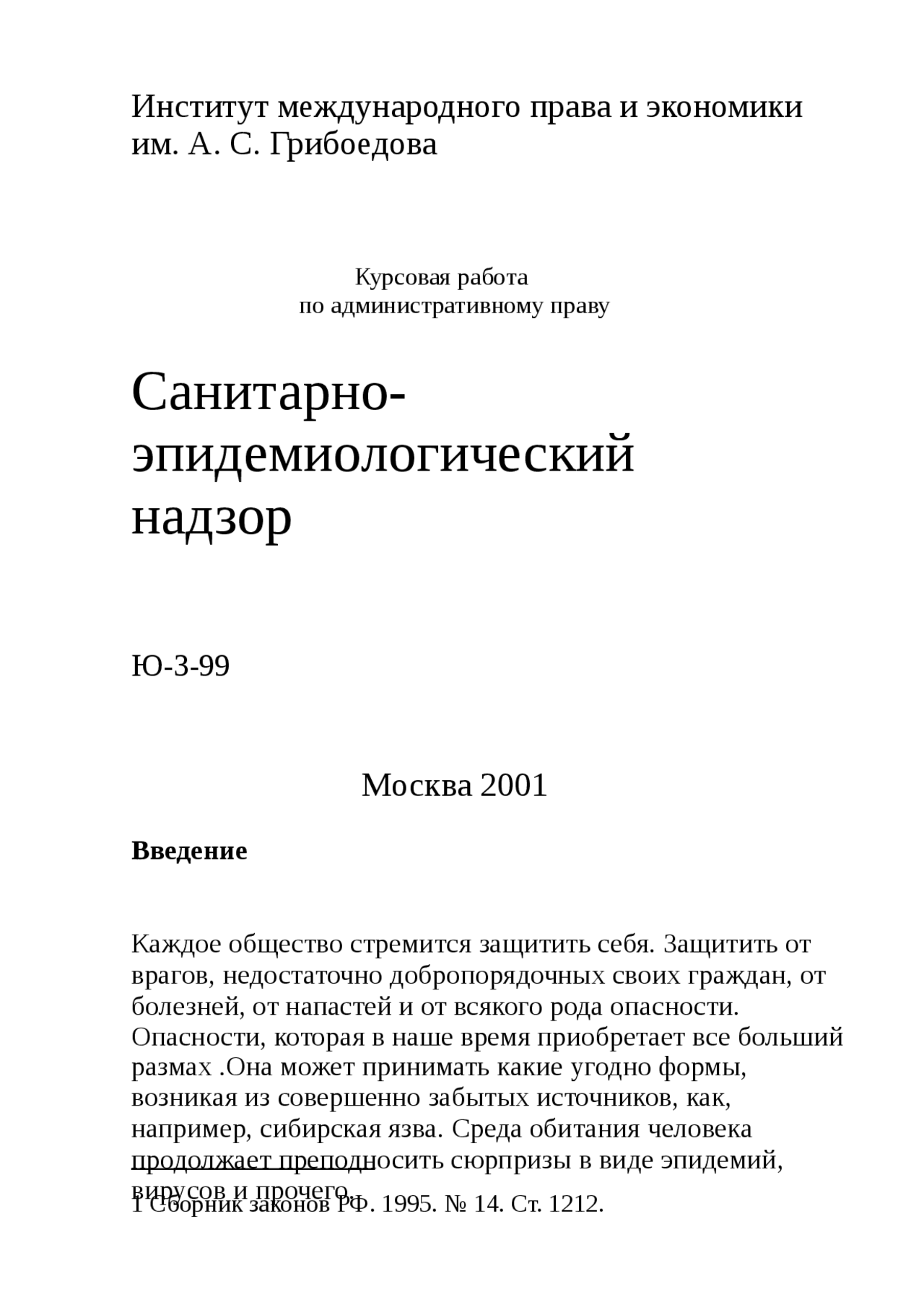 Реферат: Санитарно-эпидемиологический надзор . Институт международного права и экономики им . А . С . Грибоедова . Курсовая работа . по административному праву . Санитарно- . эпидемиологический . надзор . Ю-3-99 . Москва 2001 .