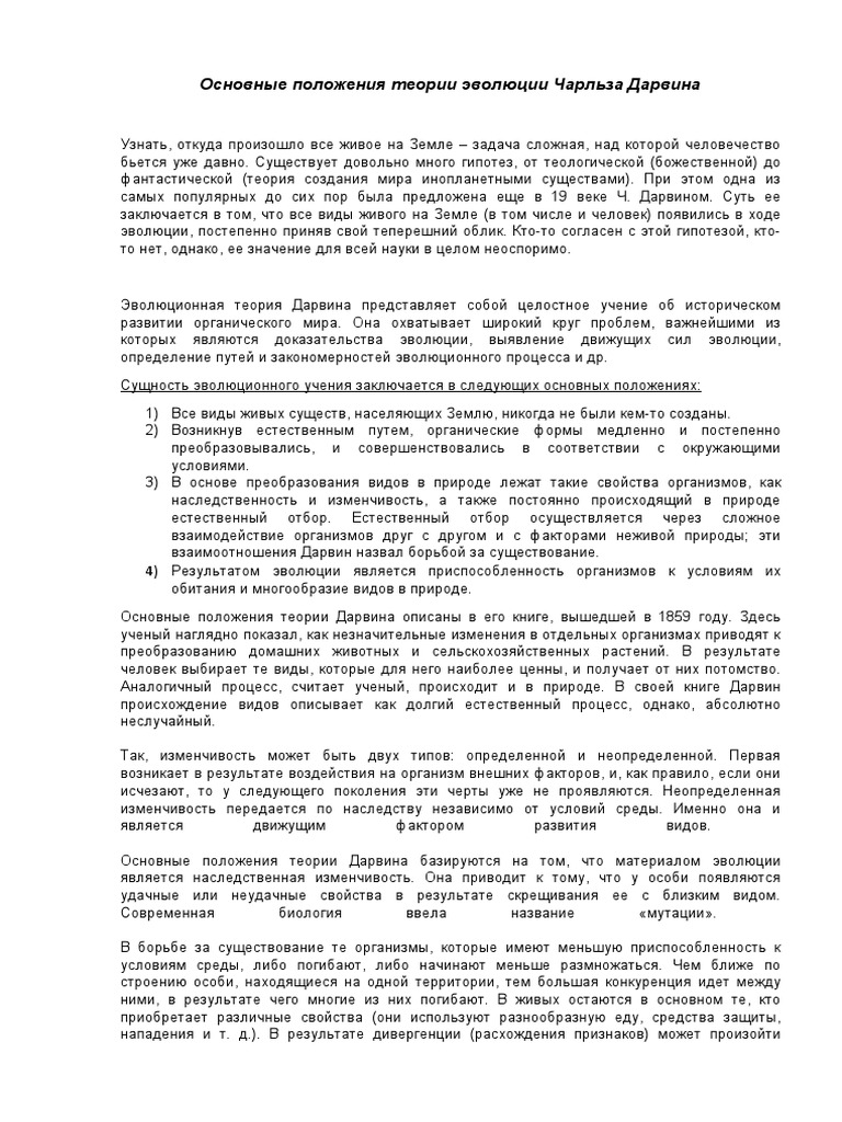 Реферат: Эволюционная теория Ч . Дарвина основные положения и мировоззренческое значение Теория эволюции Чарльза Дарвина